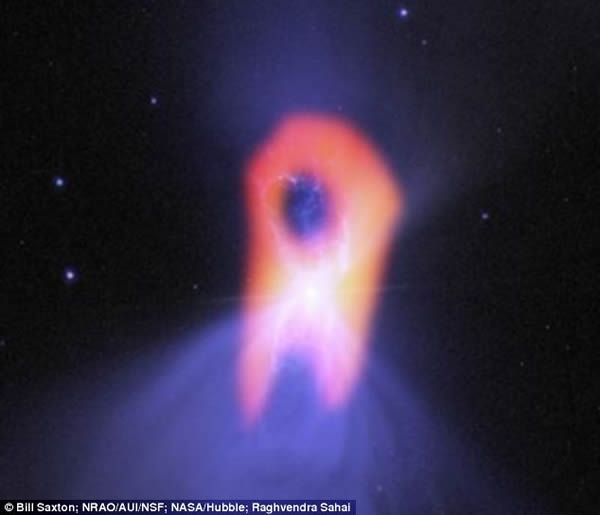 哈勃望远镜可见光下观测到的背景蓝色结构显示了双叶形状,中央有个狭窄区域。ALMA的分辨率揭示了该星云拉长的形状(见红色部分)